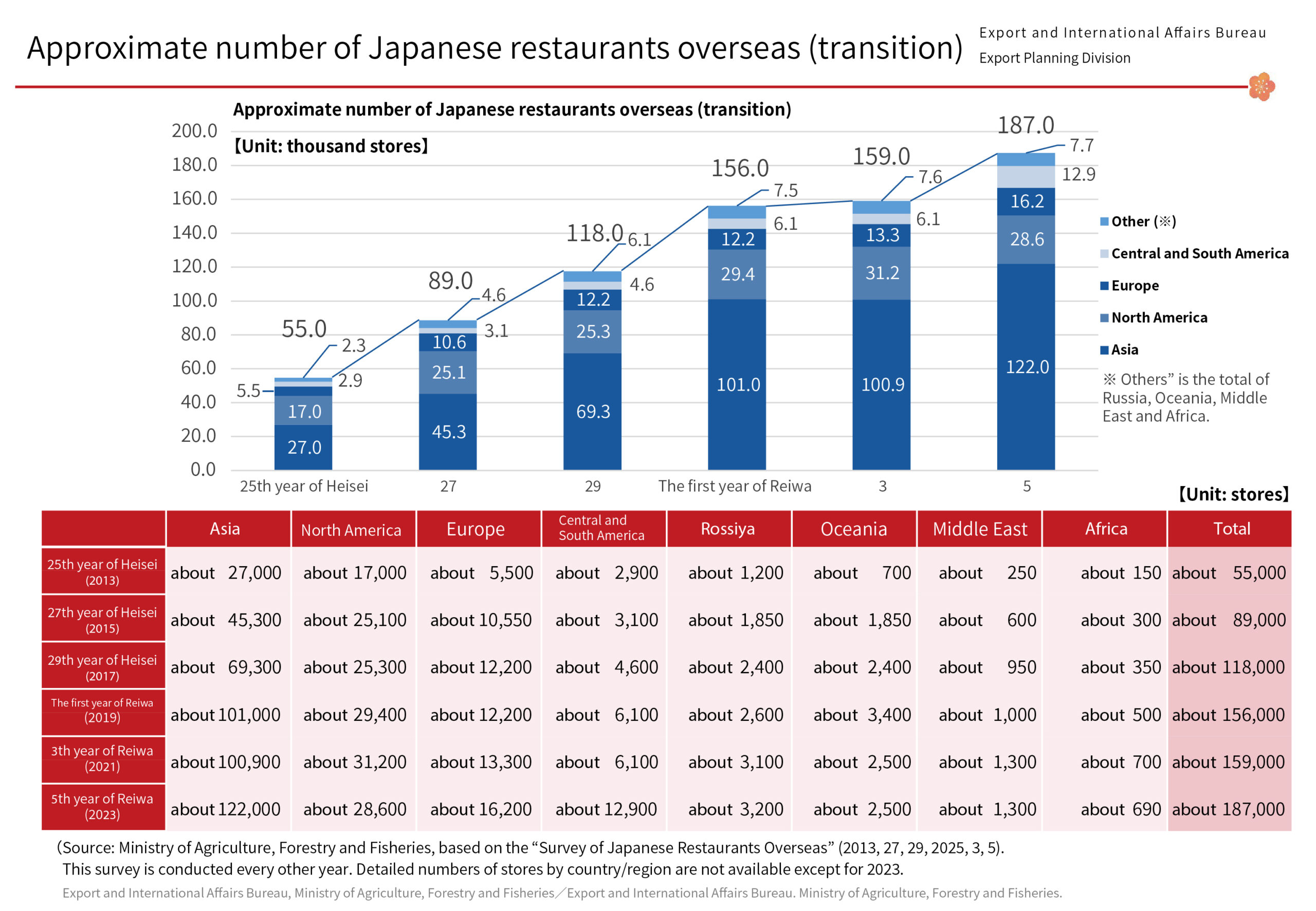According to Japan’s Ministry of Agriculture, Forestry, and Fisheries, the number of Japanese restaurants overseas has surged from around 55,000 in 2013 to approximately 187,000 in 2023—more than tripling in a decade. Asia has seen the most significant growth, with Japanese restaurants increasing from about 27,000 in 2013 to 122,000 in 2023, marking a 4.5-fold increase.