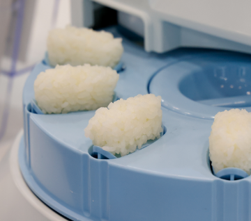 Nigiri-zushi is divided into two parts: the “neta,” which is the upper fish fillet portion, and the “shari,” which is the lower rice portion. This sushi robot automatically produces the shari portion of the sushi. The shari is adjusted to be hard enough to hold with chopsticks but soft enough to chew in the mouth. This sushi robot can hold up to 10 kg of sushi rice. There are also optional devices for placing wasabi and for making gunkanmaki (sushi rolls). The sushi robot has already been used in many restaurants, and Japanese people enjoy its taste as natural sushi. With this sushi robot, even staff with no prior training in Japanese restaurants can start making sushi.